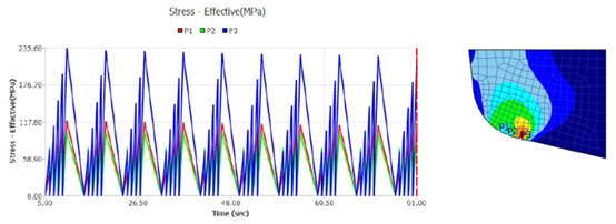 3D几何磨损更新疲劳是影响模具寿命的重要因素,疲劳分析需要批量生产中模具应力的循环加载历史(应力/应变变化),而传统的耦合法模具应力分析计算量大,插值法应力分析只能同时计算某一个时刻的应力分析,DEFORM软件在新的版本中对计算效率高的插值法设置进行更新,允许选择多个时刻的受力状态,同时进行插值法模具应力分析,快速提取模具的应力/应变加载过程。