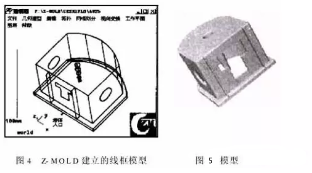 (1)建模。利用Z-MOLD前置处理模块完备的造型功能,将制件(图3)的几何信息输入计算机,生成图4线框模型(为方便起见,图中只显示1个型腔的线框模型)。在定义线框的拓扑关系后,进行三角形网格剖分,形成网格文件:加速器.fem。制品的几何文件准备完毕。