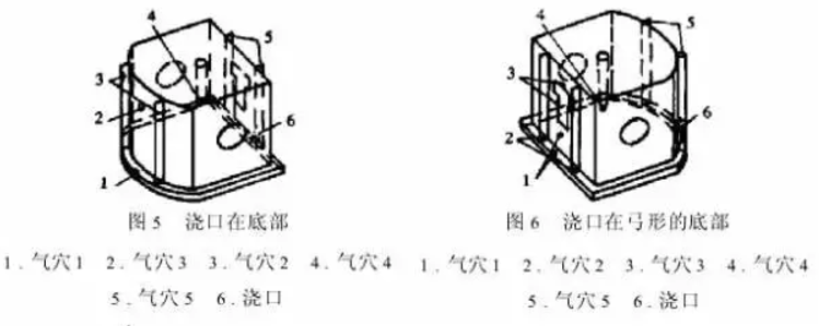 通过Z-MOLD软件分析预测出塑件在充填结束后可能会产生气穴的地方。如图6气穴2可以在顶出装置中利用顶杆配合间隙排气,但图5气穴3形成在塑件的弓形面上不便于气体逃逸,图6气穴1形成在垂直于分型面的平面上也不便于气体排出。图7的气体都可通过分型面的间隙排出。从熔体整个充填过程看,图7的浇口位置最利于气体的排出。通过流动分析预测出气穴位置及时采取补救措施。图6的调整方案为降低注射速度让气体有充足的时间排出型腔。