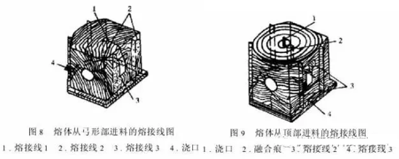 图8和图9是两种浇口方案,用Z-MOLD软件分析得到的熔接线图。如图8所示,因为塑料熔体充填型腔时弯折多、流程长、注射压力损失大,前锋料头温度下降现象严重,最后型腔最低温度为215℃,熔接痕处力学性能较差。图8的第3,4条熔接线处可能同时有气穴存在,这样该处强度会明显削弱。如图9所示,塑料熔体流程相对图8的流程要短,压头损失、温度变化相对图8要少。试验表明,提高注射压力、熔料温度和模壁温度有助于克服浇注系统对熔体的流动阻力,能有效地将压力传递到料流前,于是料流汇合处能在较高压力下融合,从而熔接痕处密度增大,强度提高;图9第1条融合痕距浇口近,这意味着注射压力对该处作用较强,熔体温度相应较高,故熔体融合得较好,其它各处的熔接线形成的位置不是主要受力区。应该注意的是,由于制品结构本身的要求使熔接线/融合痕不可避免,但通过控制相遇的两股熔体温度差(不超过10-C)、提高注射压力和模壁温度等工艺条件使熔体融合处的强度提高一些。