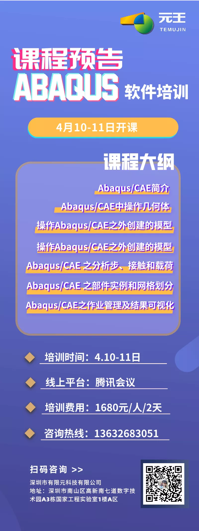 元王4.10-11日将开展为期两天的“Abaqus软件线上基础培训”,欢迎感兴趣的朋友们报名参加!
