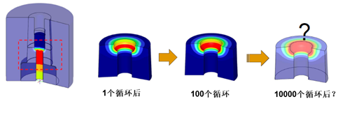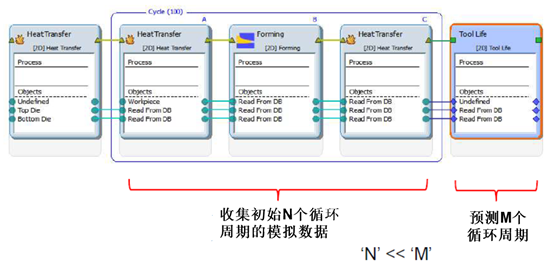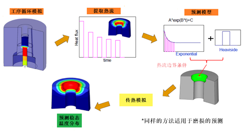 批量锻造生产下模具温度模拟原理如下图所示,工艺研究人员先模拟设置一个循环周期的前处理设置,包括了模具锻前、锻中、锻后的传热、喷雾冷却等模拟,形成一个完整生产周期的模拟,再对整个工序N次循环模拟,之后对每次循环模拟的热流结果提取,通过数学模型预测后期的热流变化,将热流重新施加到模具表面,得到M此循环周期后的温度分布,这里N的值远远小于M。同样的方法也适用于模具磨损预测。