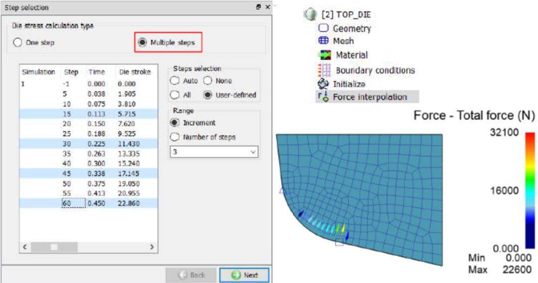 3D几何磨损更新疲劳是影响模具寿命的重要因素,疲劳分析需要批量生产中模具应力的循环加载历史(应力/应变变化),而传统的耦合法模具应力分析计算量大,插值法应力分析只能同时计算某一个时刻的应力分析,DEFORM软件在新的版本中对计算效率高的插值法设置进行更新,允许选择多个时刻的受力状态,同时进行插值法模具应力分析,快速提取模具的应力/应变加载过程。