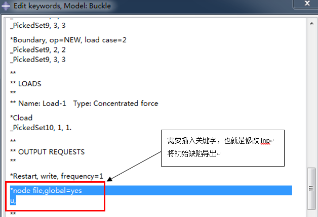 我们此次课程中采用屈曲分析方式,先计算屈曲模态,也就是先做特征值屈曲分析,此分析为线性屈曲分析,在小变形的情况下进行,得出临界载荷(一般取一阶模态的eigenvalue乘以加载的单位载荷1),且需要在inp文件中输入如下图字符,输入次字符的目的是将初始缺陷的节点输出为.fil文件;然后将1阶屈曲模态做为初始缺陷引入极限载荷后屈曲分析,后屈曲分析可以定义非线性材料及几何非线性,所以risk屈曲分析也成为非线性屈曲分析.