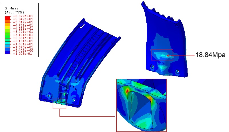 顶/底部中间耳机挂链最大等效应力为45.22Mpa,低于材料屈服强度54Mpa。